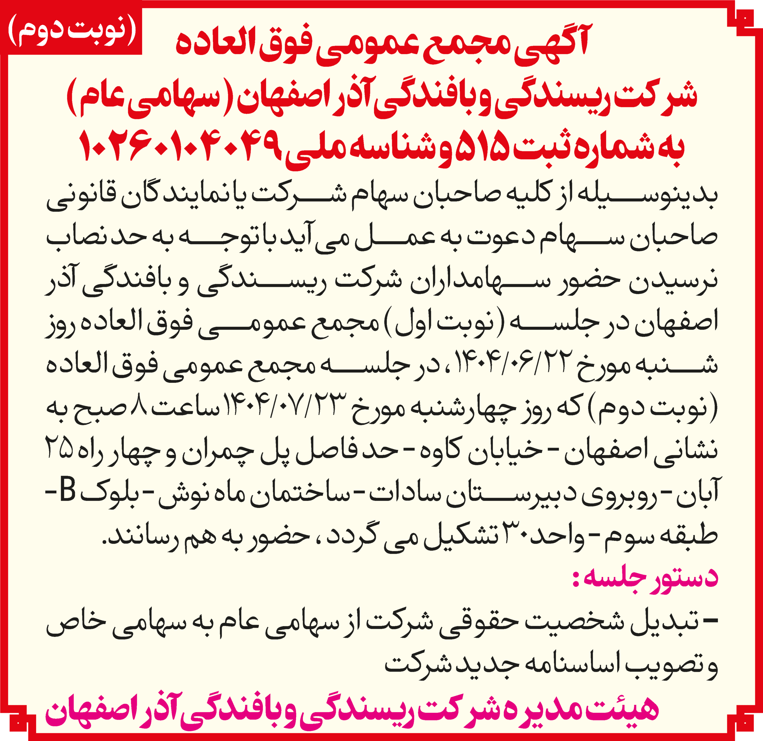 بدینوسیله از کلیه صاحبان سهام شرکت یا نمایندگان قانونی صاحبان سهام دعوت به عمل میآید با توجه به حد نصاب نرسیدن حضور سهامد . . .